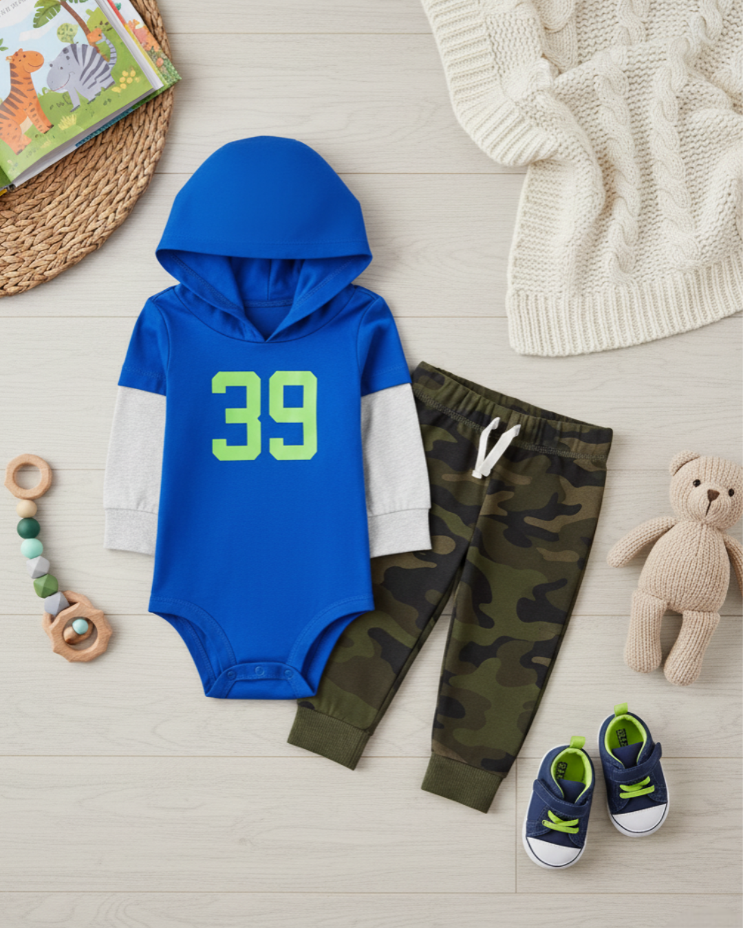 - 🏈 "Varsity 39" 2-Piece Set: A sporty royal blue hooded long-sleeve bodysuit with varsity numbering, paired with trendy camouflage-print joggers.
